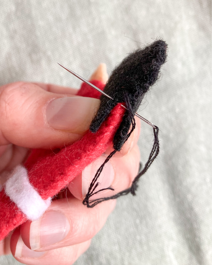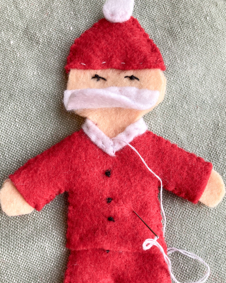 Use black embroidery floss to add three french knots down the front of Santa’s shirt. Only poke your needle through the top layer of shirt and body panel so there won’t be any black thread showing out the back.